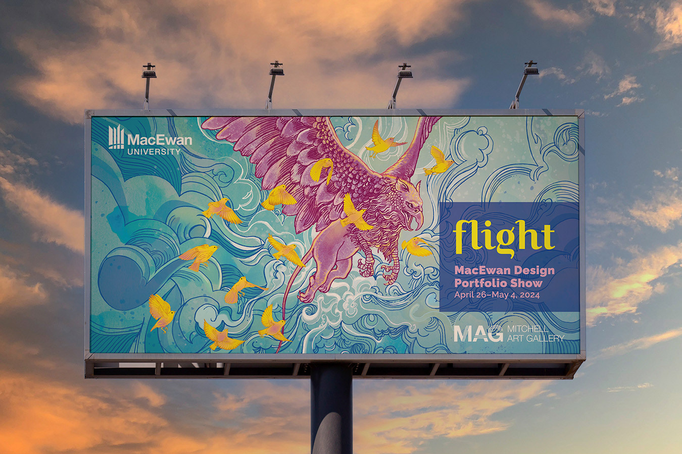 The griffin symbolizes MacEwan University and the birds represent the students, as we fly together reaching new heights.